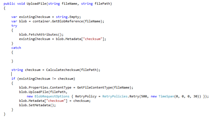 So I invested some time to implement what we called the SmartUploader. This class is very simple, it acts as a wrapper around the Azure Storage Client API. Each time this class uploads a file it calculates a checksum value and stores it in the blob metadata. So the next time before uploading the file it compares the current checksum of the file to upload with the checksum of the previously uploaded file and if it is the same the it avoids the upload because it means that the file has not changed.