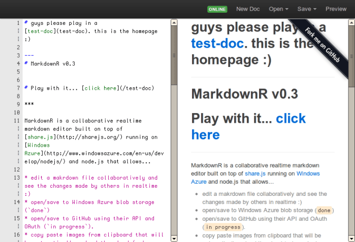 Se trata de MarkdownR, un editor colaborativo en tiempo real de markdown desarrollado con share.js. En verdad vale la pena tomarse unos minutos para darle una mirada, pueden accederlo aquí: http://markdownr.cloudapp.net/.