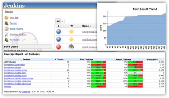 La última innovación a mencionar es la práctica de integración contínua. Si bien este tema lo vemos en la teoría desde hace varios cuatrimestres, este año fui más allá y levante un servidor de integración contínua para mis alumnos (lamentablemente no tenía una gran infraestructura, asi que solo lo pude hacer para los 3 grupos a mi cargo). El proceso de build incluyó: compilación, ejecución de pruebas y medición de cobertura.