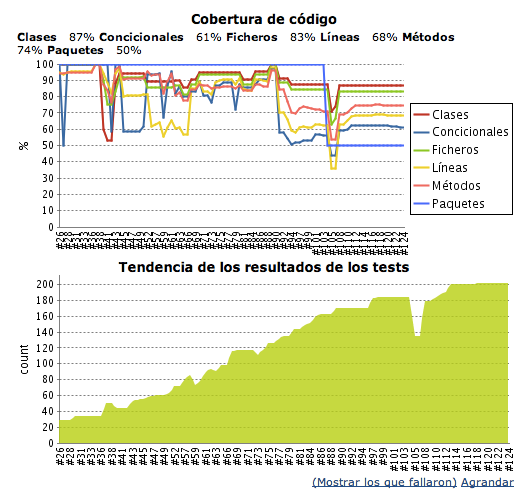 Otra práctica que hemos establecido por completo en el curso de los miércoles es el uso de Jenkins como servidor de integración continua para el desarrollo de los trabajos finales. El uso de Jenkins en conjunto con Ant y algunas otras herramientas más, nos permitieron obtener ciertas métricas sobre el código de los alumnos al mismo tiempo que les facilitó la integración del trabajo a cada equipo.