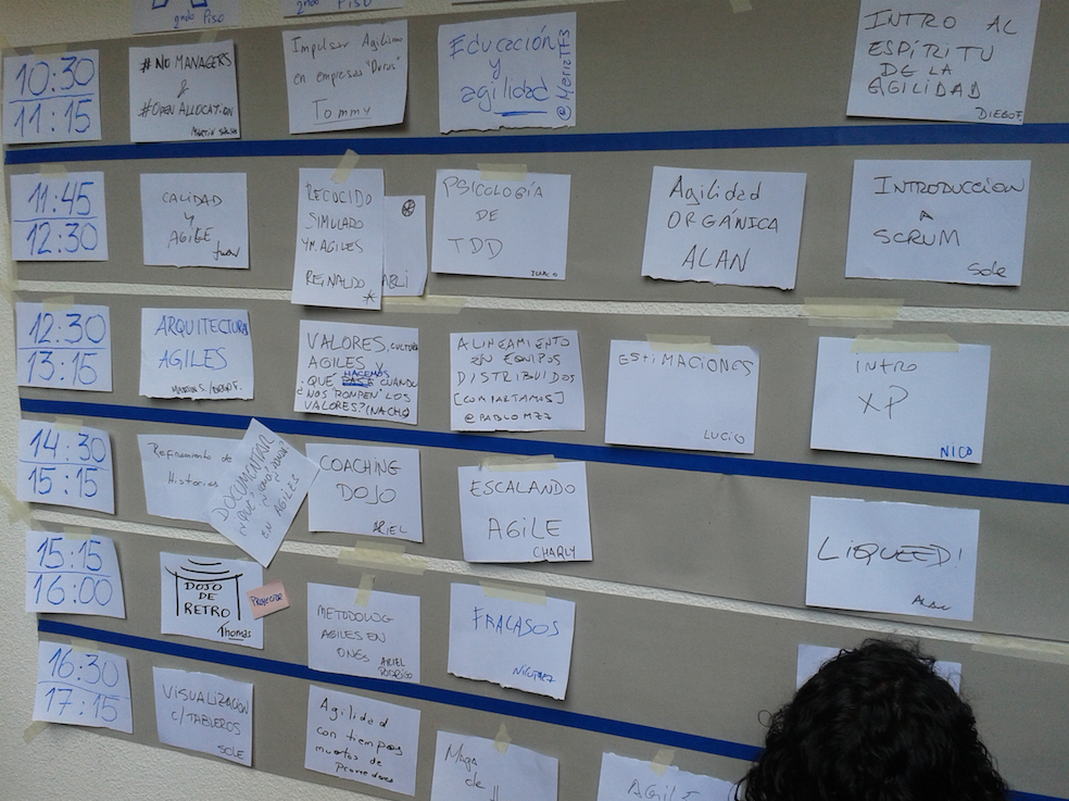 Esta sesión también la propuse yo, esta vez con la idea de debatir sobre los criterios de éxito de los proyectos y compartir experiencias no tan exitosas entre los asistentes. Comenzamos hablando sobre los parámetros tradicionales de éxito (tiempo, alcance y costo) y luego de compartir algunos casos fuimos replanteando esta visión a la luz de los métodos ágiles. Me gustó mucho cómo salió la sesión y me sorprendieron (para bien y para mal) algunas opinión que encontré entre los asistentes.