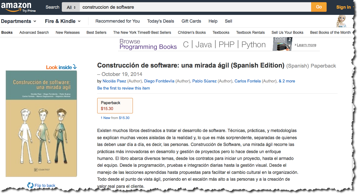La semana pasada cumplimos un nuevo hito con el libro, llegamos a Amazon. El libro puede encontrarse fácilmente buscando por «construccion de software» o directamente siguiendo este link.