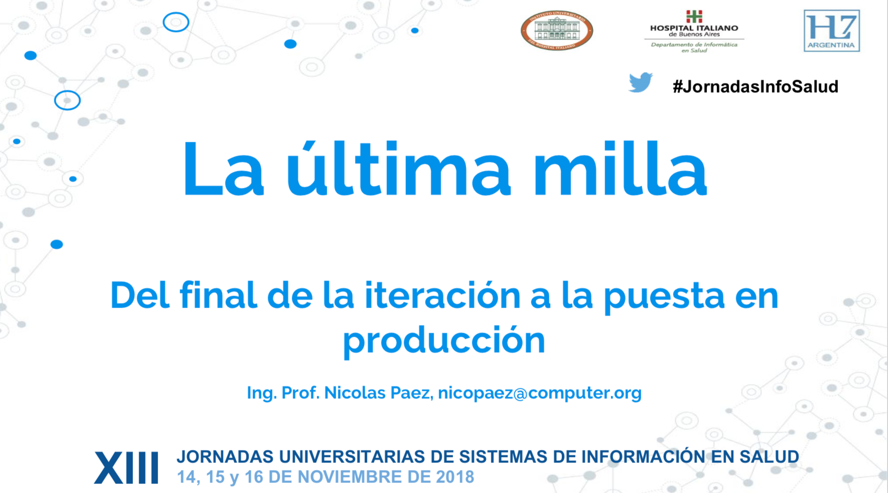 Me tocó abrir el track de Ingeniería de Software con una chala que titulé «La última milla: del final de la iteración a la puesta en producción«.  La idea fue: