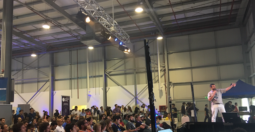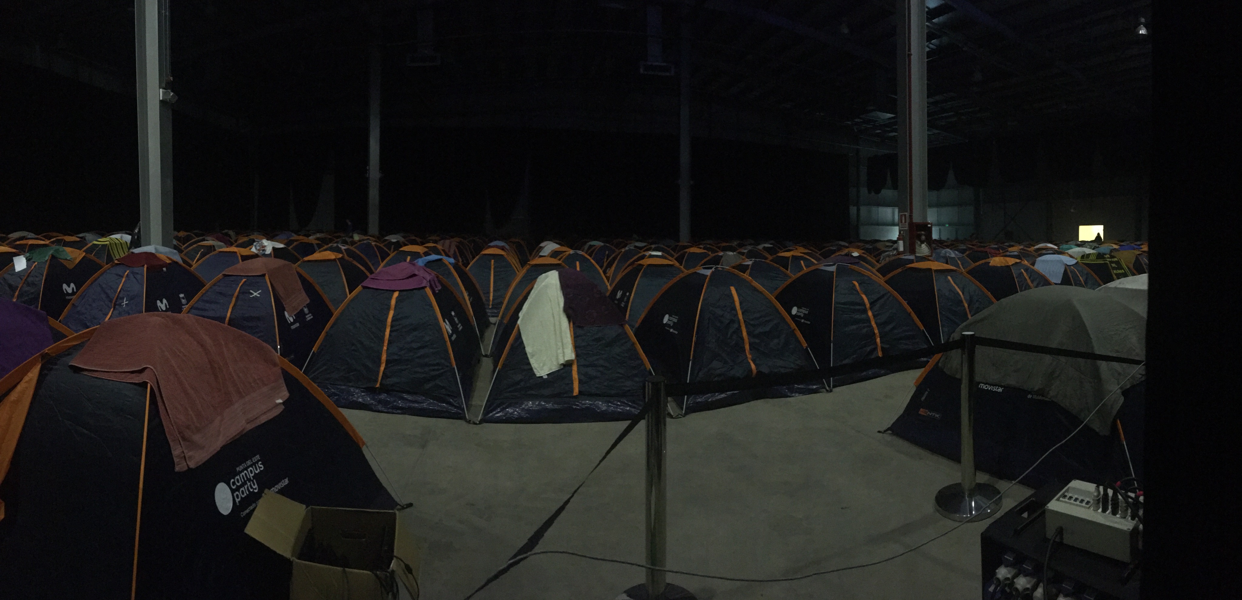 Algunos datos de contexto general para empezar. El espacio del evento estaba dividido en zonas. La sala principal tenia stands en el centro, tres escenarios para charlas magistrales, la zona de workshops, dos espacio de trabajo (con tomas y cables de red) y la zona de prensa. En otro salón estaba la zona de comidas y finalmente en un tercer salón la zona de carpas.