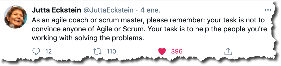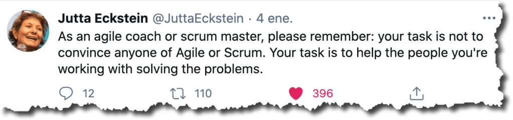 - En esa reunión con «la gente de la trinchera» yo intento validar la situación problemática descripta inicialmente por quien me contactó. Para ello escucho y pregunto. A medida que voy confirmando la situación voy haciendo alguna pregunta/sugerencia del tipo «¿Y ante eso probaron XYZ?» siendo XYZ típicamente una práctica ampliamente difundida.
