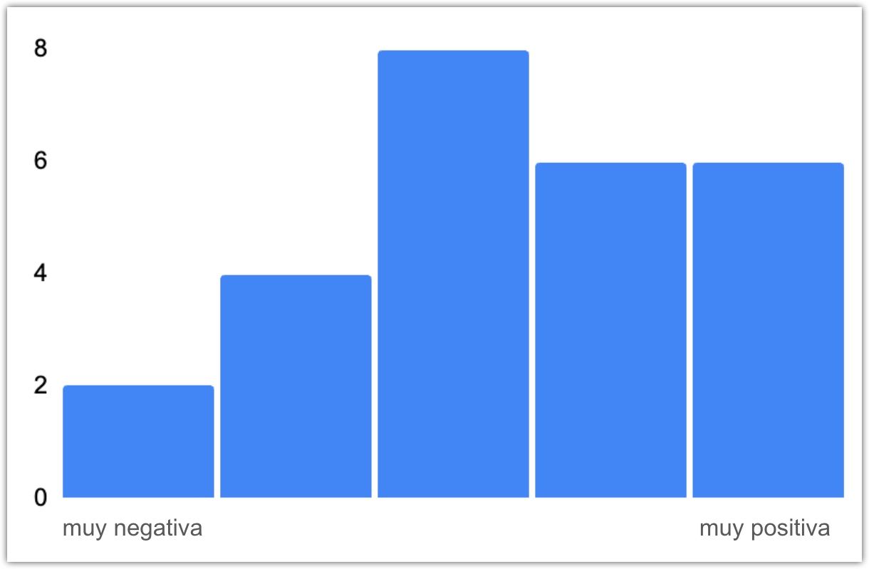Más allá de todo lo anterior, y que en un punto era esperable, lo que más nos llamó la atención fue la diferencia de opinión cuando preguntamos si consideraban positiva o negativa la irrupción de IA en la educación, el siguiente histograma muestra la consolidación de las respuestas.