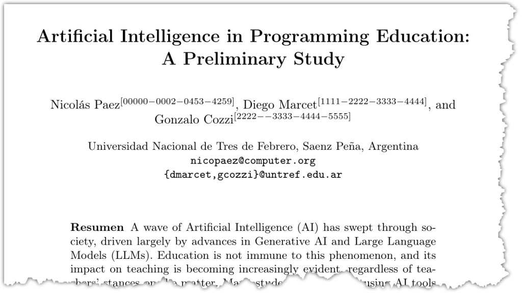 Pero ya desde un tiempo la IA comenzó a meterse en mis cursos y eso nos obligó a tomar el tema. Es por eso que a comienzos de este año junto a Diego Marcet y Gonza Cozzi (miembros de mi equipo docente en UNTreF) nos pusimos a estudiar formalmente el tema. En concreto comenzamos estudiando el uso de la IA en la enseñanza de la programación. Hicimos una revisión de papers y encuestamos a docentes de programación. Esta iniciativa quedó plasmada en un artículo que enviamos al Simposio Argentino de Educación en Informática y que estaremos presentando en Agosto en el contexto de las Jornadas Argentinas de Informática.
