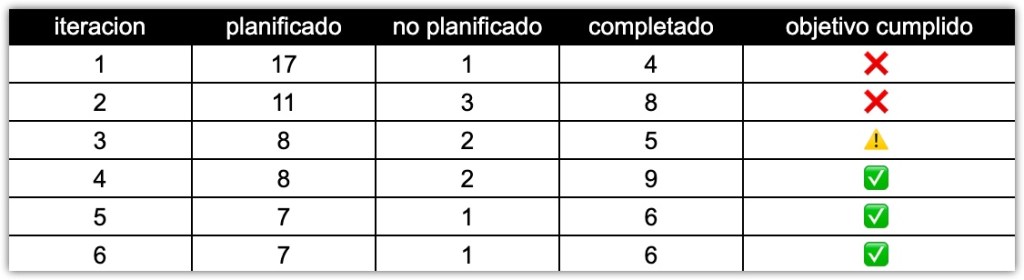 Luego de unas 3 primeras iteraciones un poco accidentadas, ya hemos logrado equilibrio con un flujo de trabajo bastante armónico y decente. Esto puede observarse, entre otras cuestiones, en las métricas recogidas en la siguiente tabla.