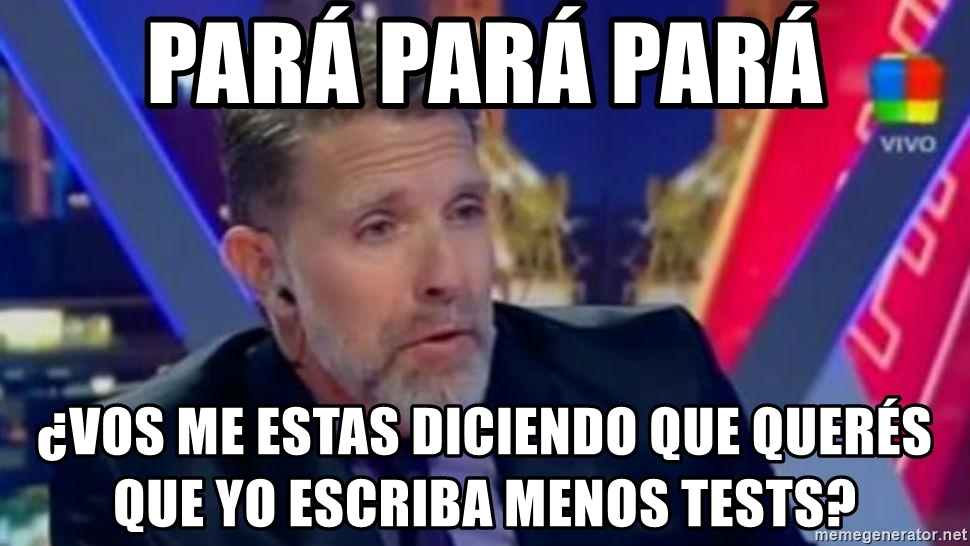 El desafío me resulta interesante pero también desgastante y hasta frustrante por momentos. En una ocasión llegué a tener una discusión porque un colega insistía en que hacía demasiadas pruebas y que eso hacía más lento el desarrollo. Y por ello pretendía que yo escribiera menos pruebas. Yo no podía creer lo que estaba escuchando. De hecho inicialmente no lo entendí. En un momento me sentí como Fantino diciendo: «Pará pará pará, ¿vos me estas diciendo que queres que yo escriba menos pruebas?». Naturalmente al hacer TDD uno suele escribir más pruebas que cuando se agregan las pruebas a posterior, con lo cual podría decirse que es cierto «hago muchas pruebas». Pero de ninguna forma creo que eso haga más lento el desarrollo, al menos no en un grado relevante. O sea, es cierto que si hiciera menos pruebas podría llevarme menos tiempos ¿pero cuanto menos? ¿5 horas en lugar de 6? No creo que esa diferencia en tiempo justifique «romper» mi proceso. Trabajo de una forma que me da seguridad y me permite trabajar de una forma eficiente, confiable y predecible.